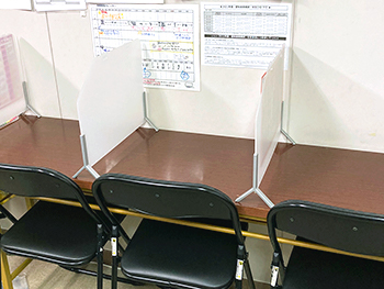 使用する座席の間隔を空け、机には仕切りを設置しています。