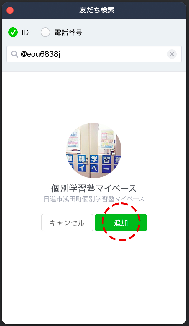 以下のボタンから『個別学習塾マイペース』のLINE@ページにアクセスしてください。 または、LINEアプリの『友だち追加』にて個別学習塾マイペースのID(@eou6838j)を入力し、検索してください。
